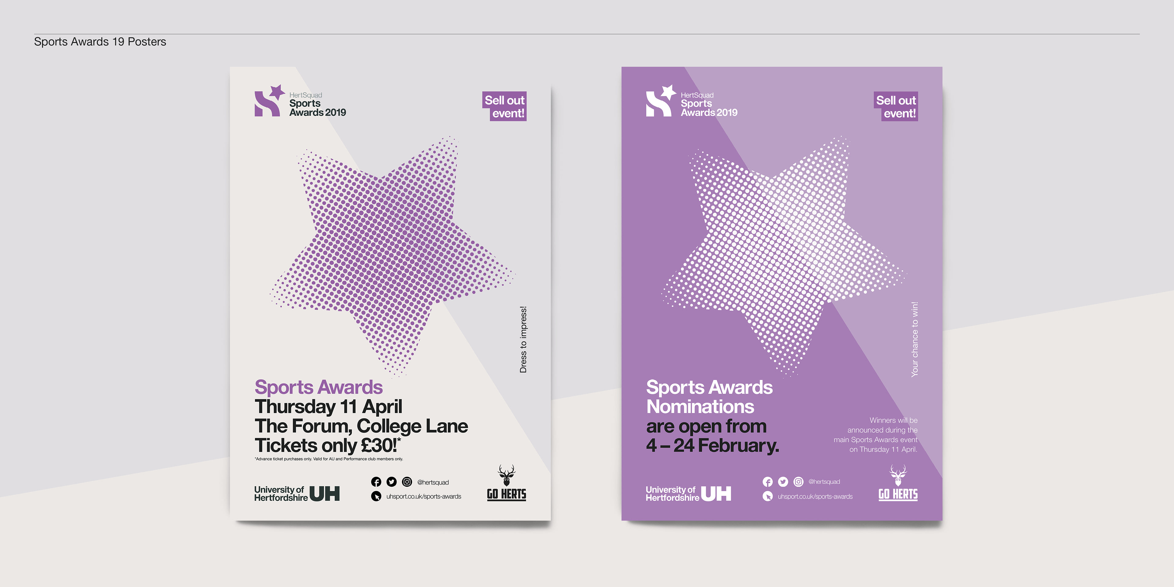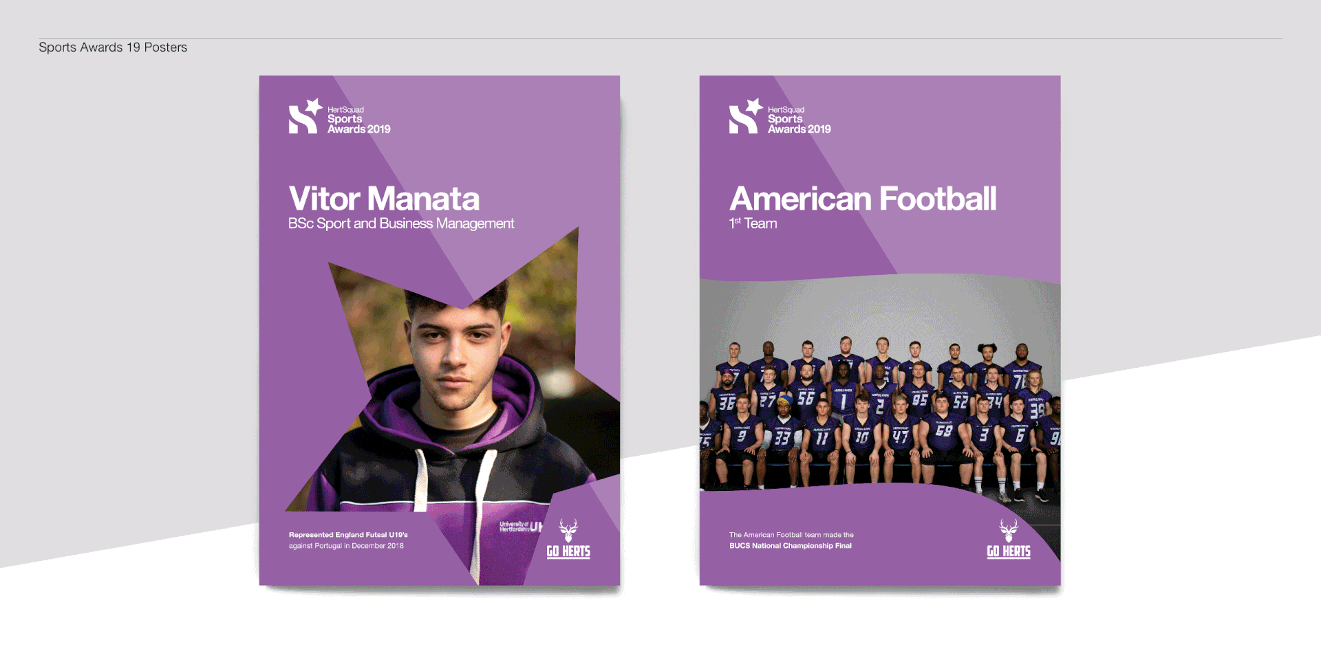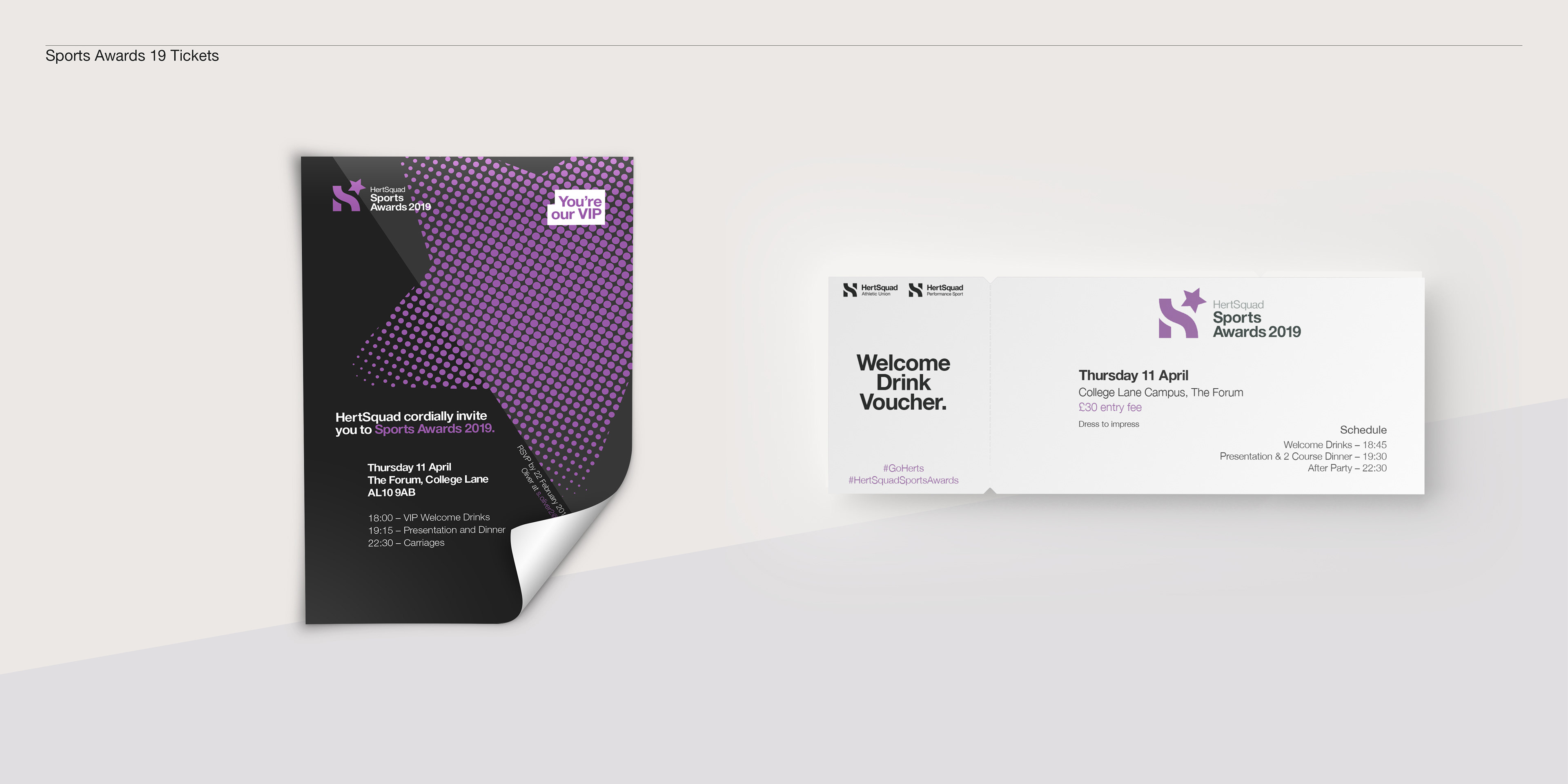 Sports Awards is another annual event that takes place the day after Varsity. We produced a brand new logo and visual identity for this. The look we went for featured vector shapes to set it apart from the heavily photographic event the day before. This visual style was adapted in many ways, through the ticket design, presentation slides, posters, programmes and other miscellaneous material including badges and certificates to be presented to the winning student-athletes.